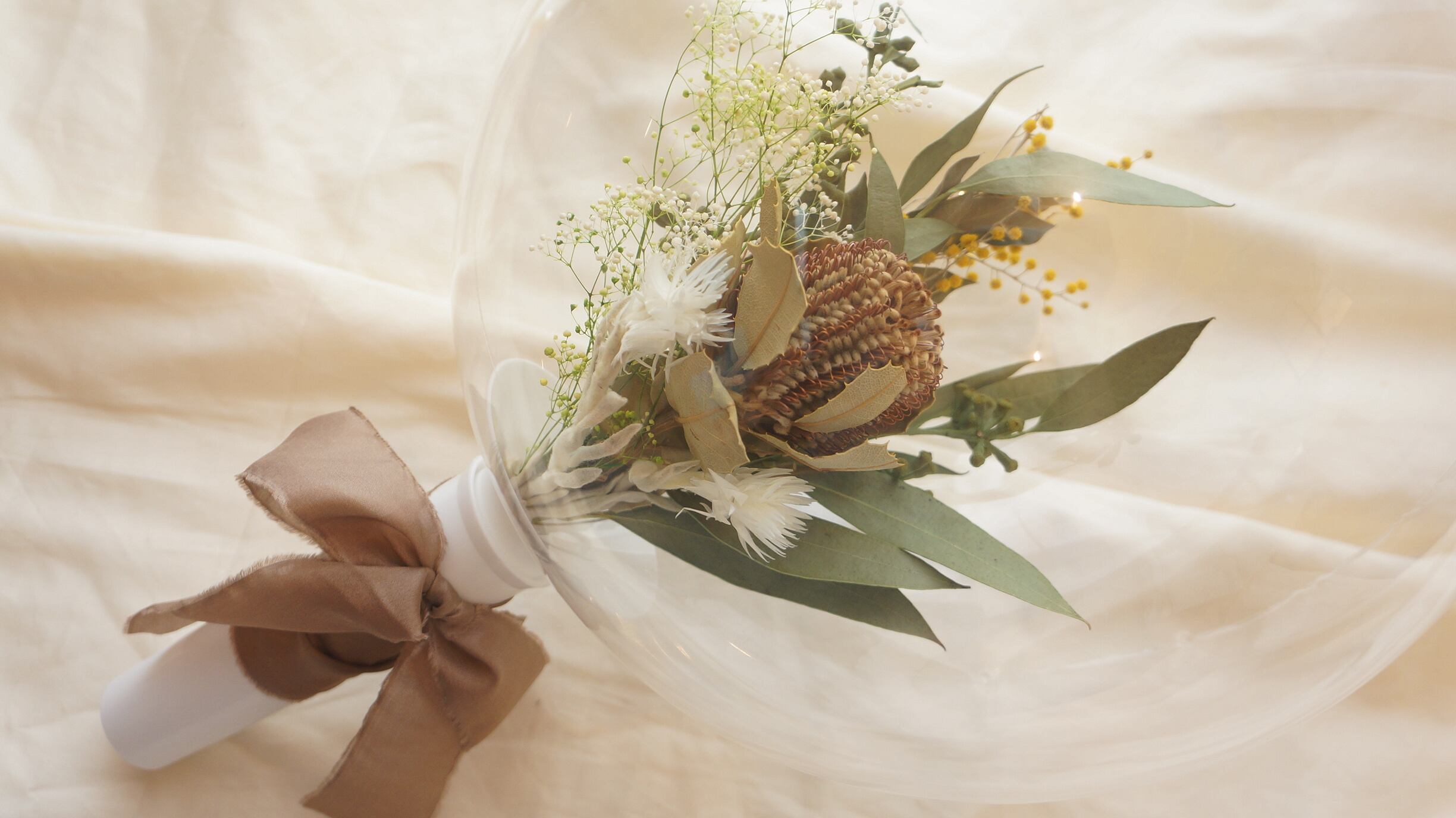 ドライフラワー、プリザーブドフラワーが入ったバルーンフラワーになります。