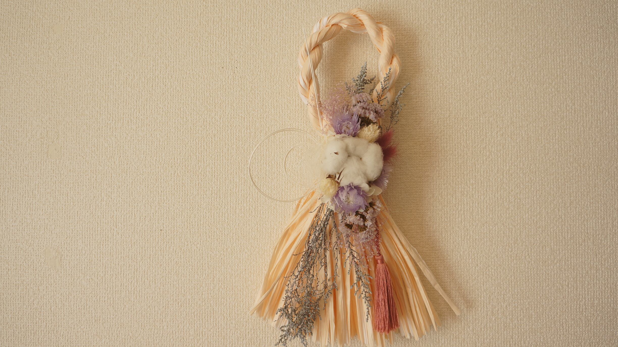 ドライフラワー、プリザーブドフラワーを使ったしめ縄になります。