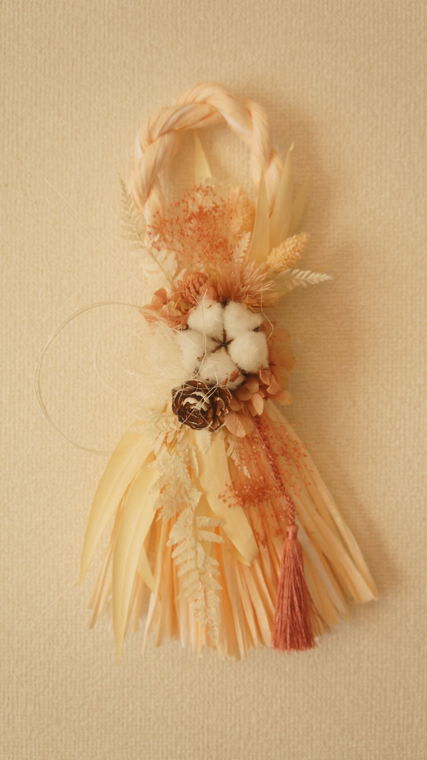 ドライフラワー、プリザーブドフラワーを使ったしめ縄になります。