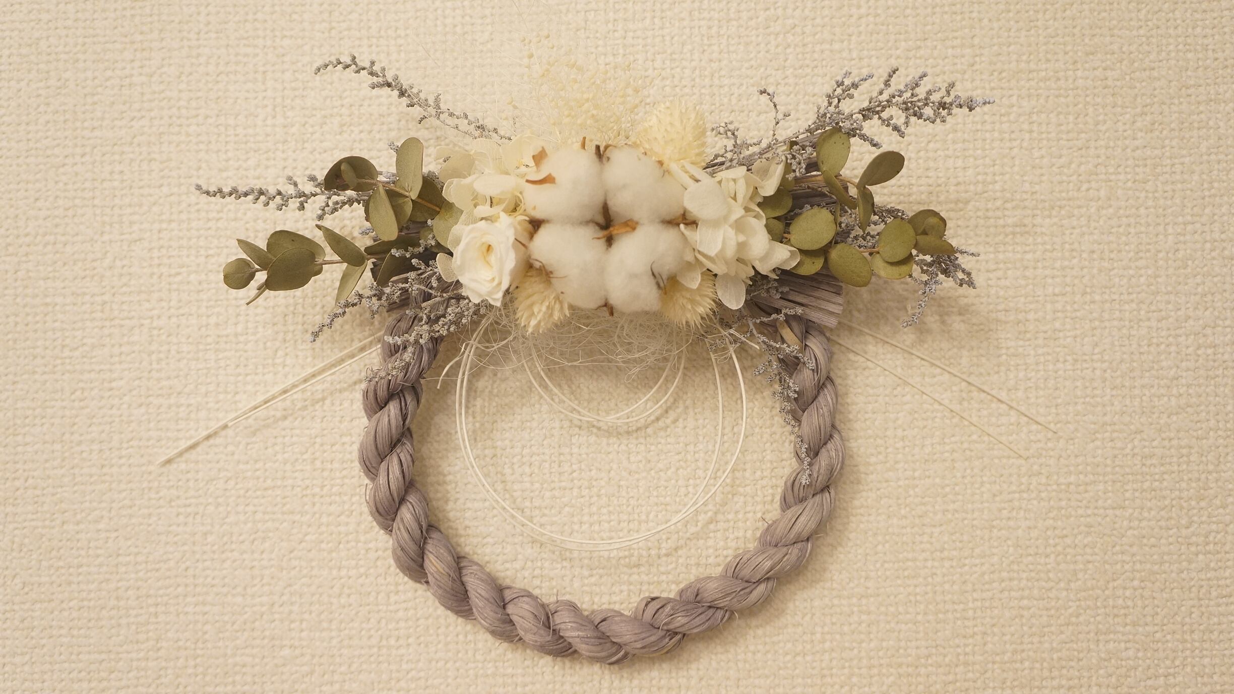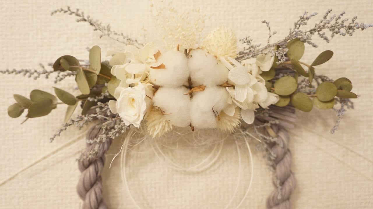 ドライフラワー、プリザーブドフラワーを使ったしめ縄になります。