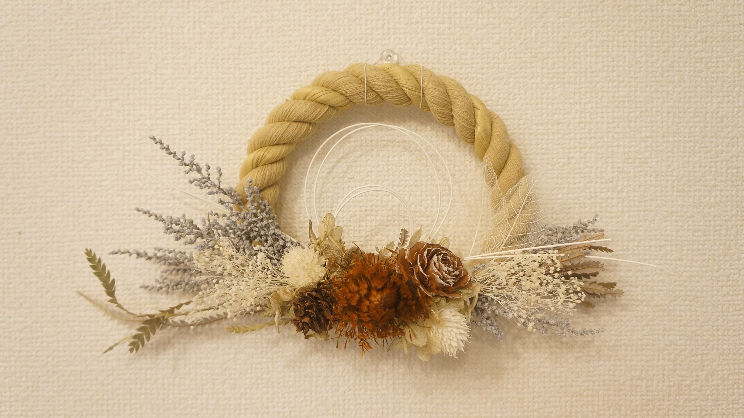 ドライフラワー、プリザーブドフラワーを使ったしめ縄になります。