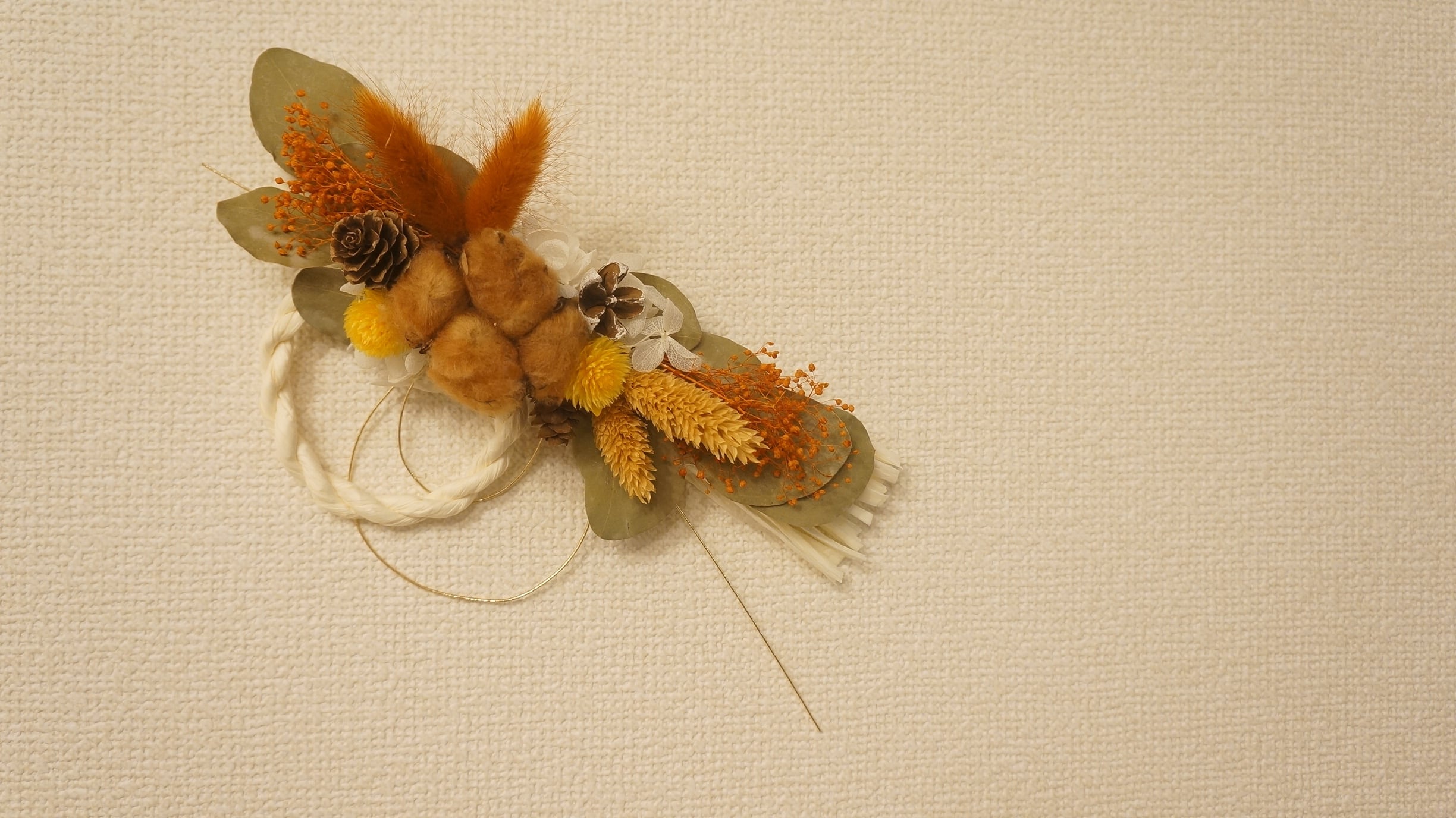 ドライフラワー、プリザーブドフラワーを使ったしめ縄になります。