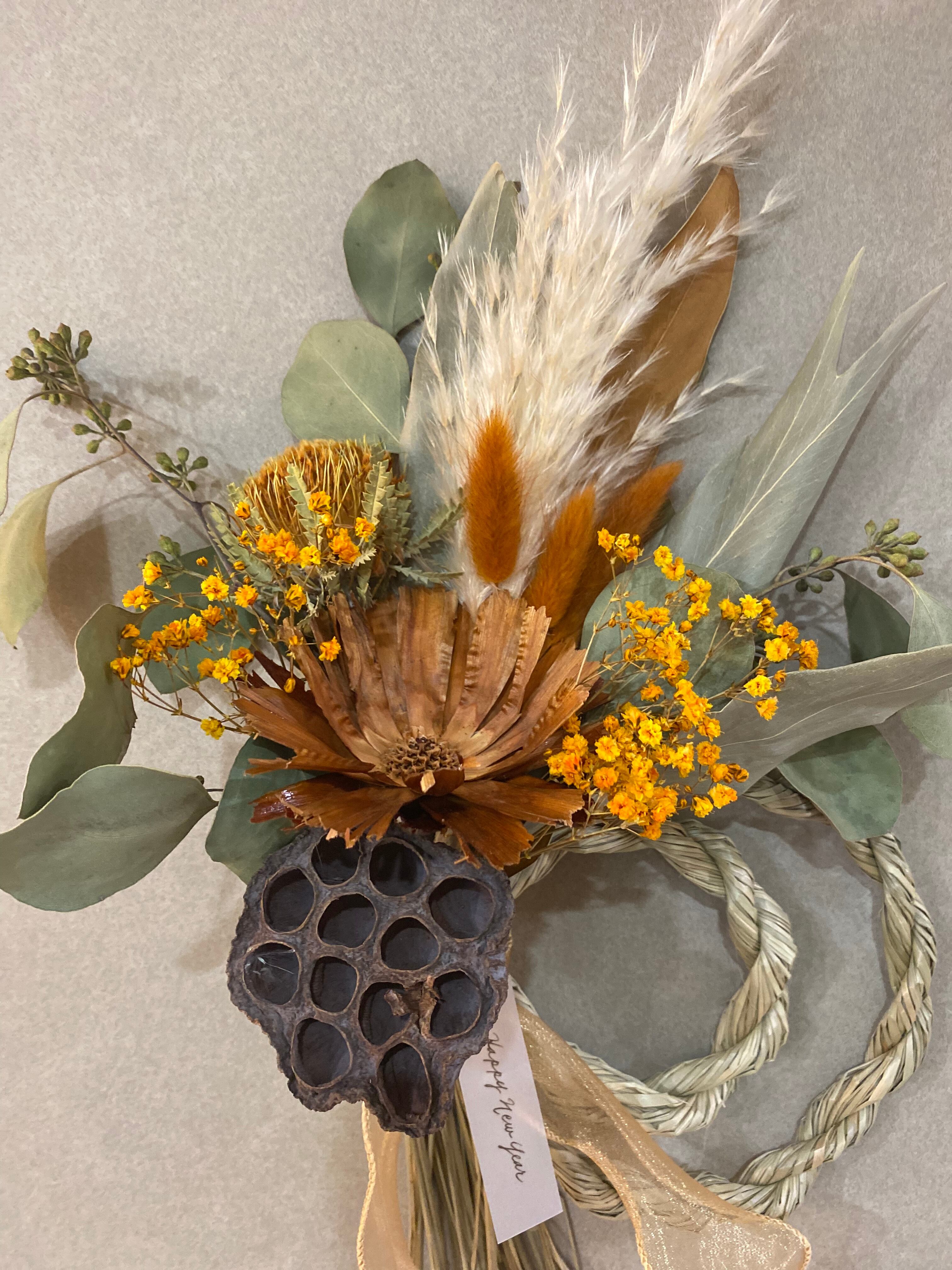 ドライフラワー、プリザーブドフラワーを使ったしめ縄になります。