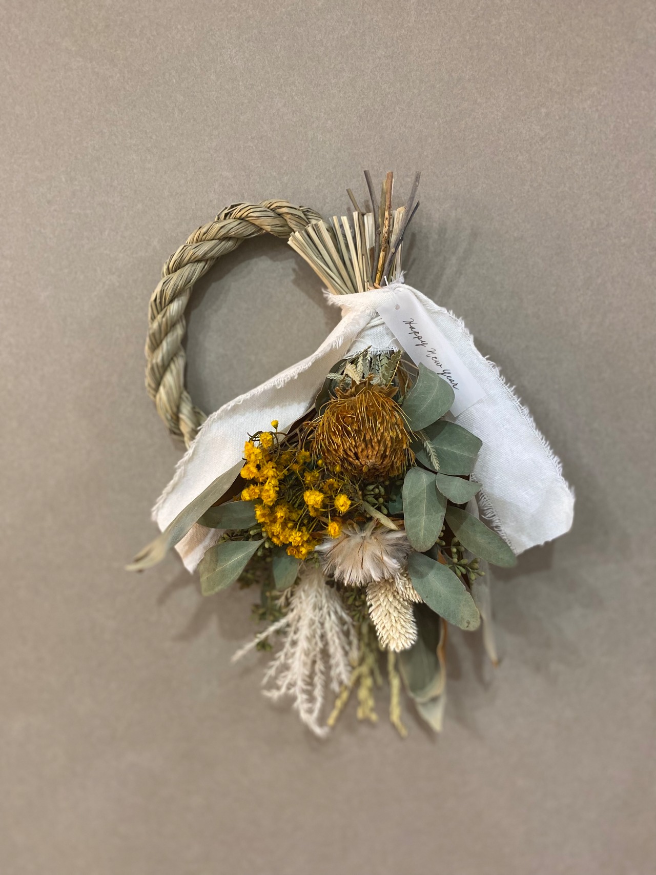 ドライフラワー、プリザーブドフラワーを使ったしめ縄になります。
