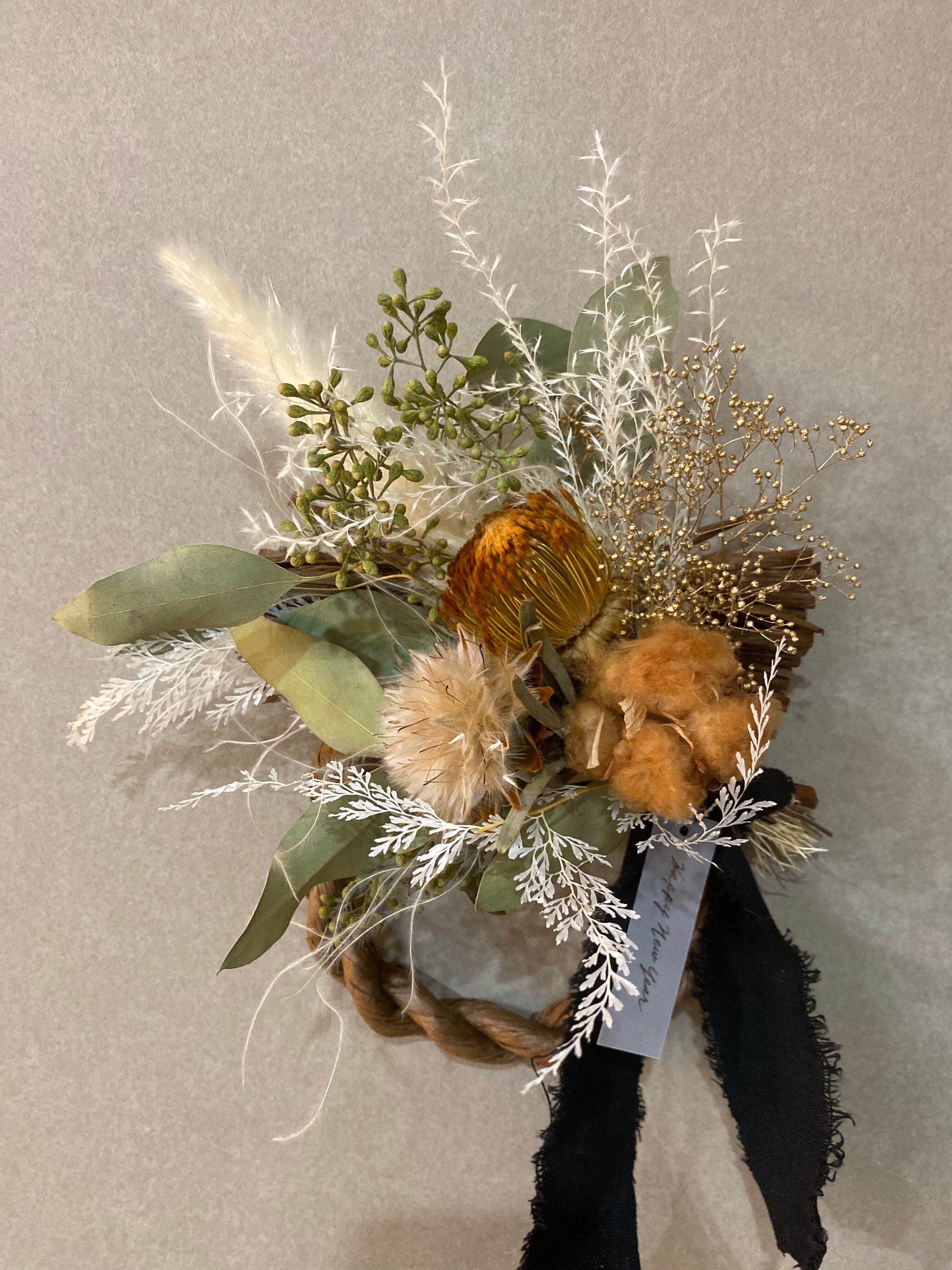 ドライフラワー、プリザーブドフラワーを使ったしめ縄になります。