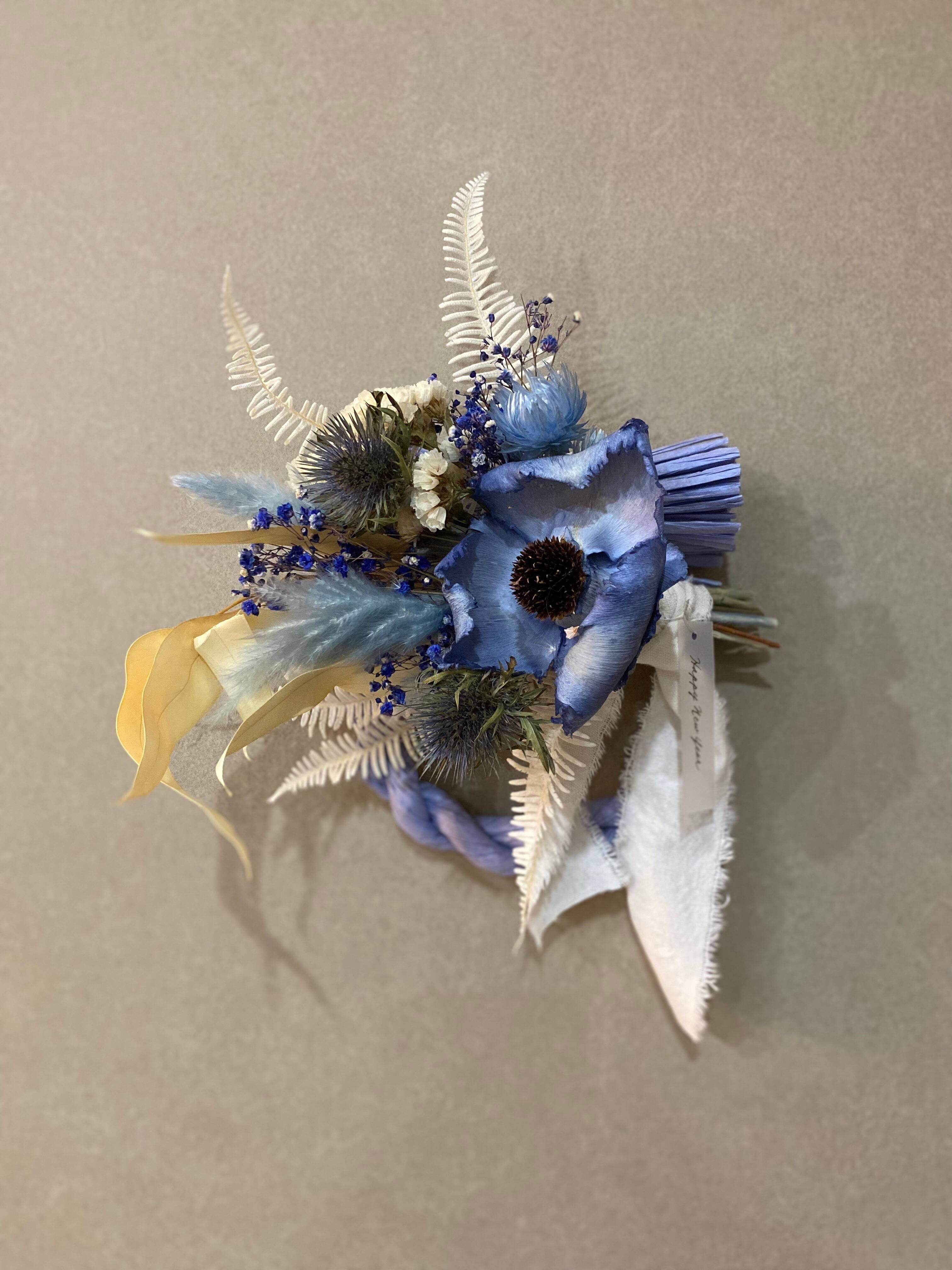 ドライフラワー、プリザーブドフラワーを使ったしめ縄になります。