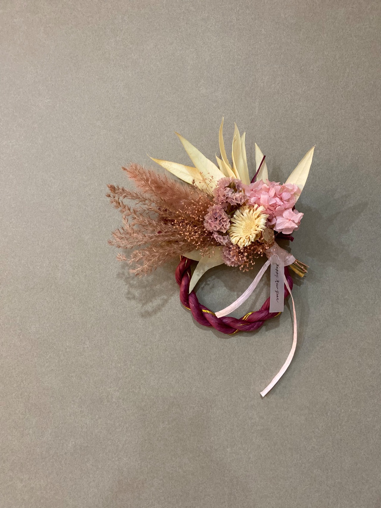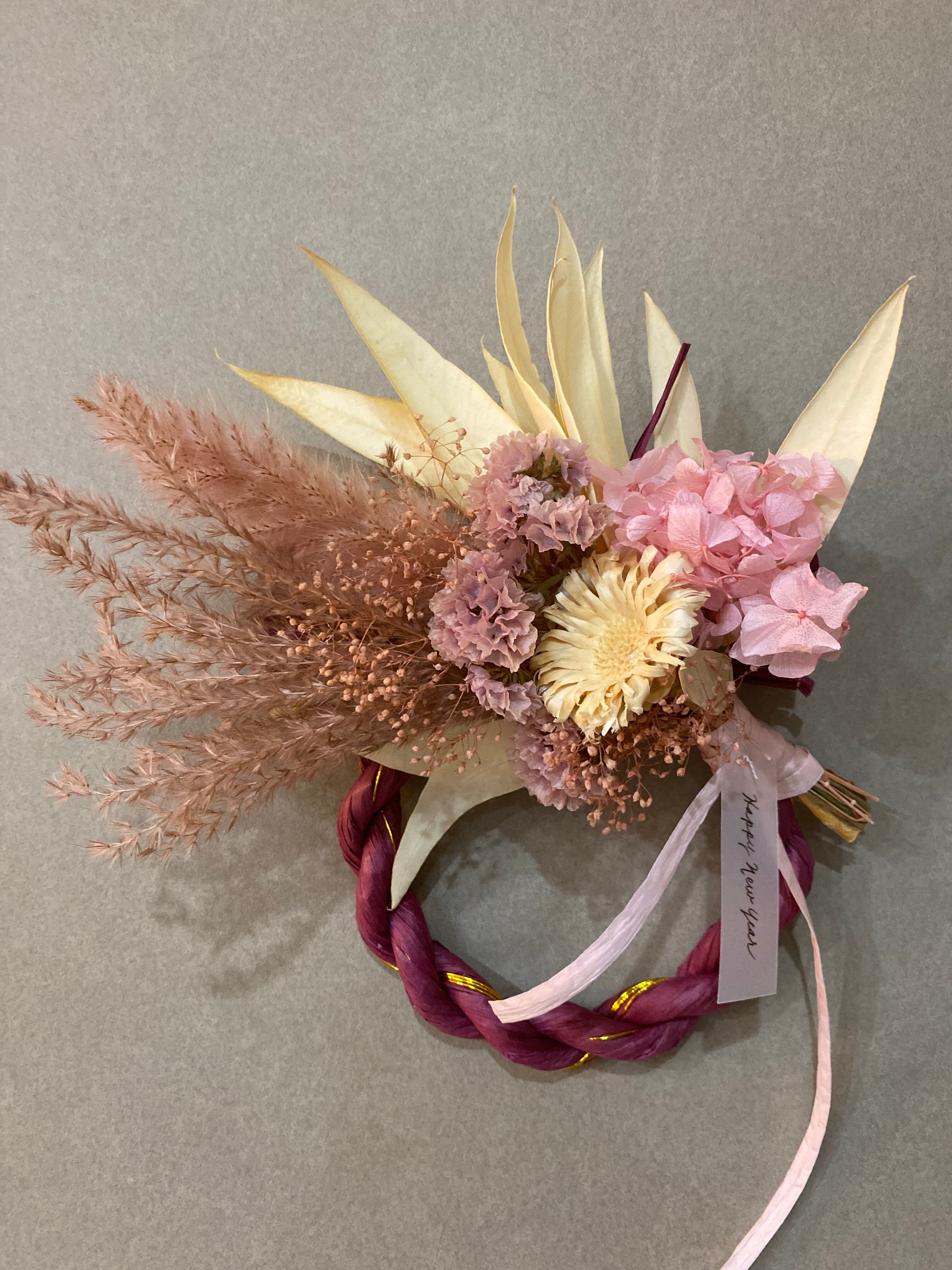 ドライフラワー、プリザーブドフラワーを使ったしめ縄になります。